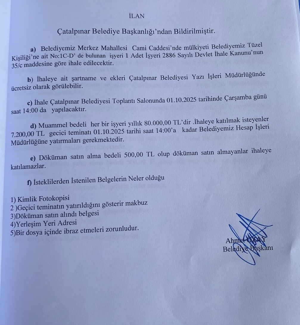 c) İhale Çatalpınar Belediyesi Toplantı Salonunda 01.10.2025 tarihinde Çarşamba günü saat 14:00 da yapılacaktır.